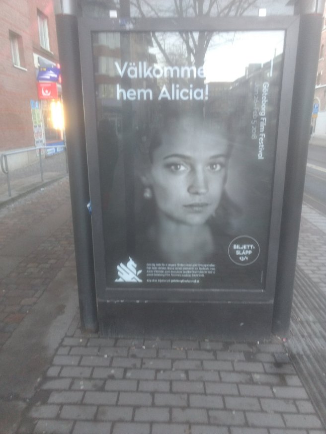 Varje år är det filmfestival i Göteborg. Under en vecka visar man en massa filmer från hela världen. Det kommer också kända personer, t ex regissörer, skådespelare och författare. Det här året kommer den framgångsrika skådespelerskan Alicia Vikander på besök. Det är henne vi ser på affischen.