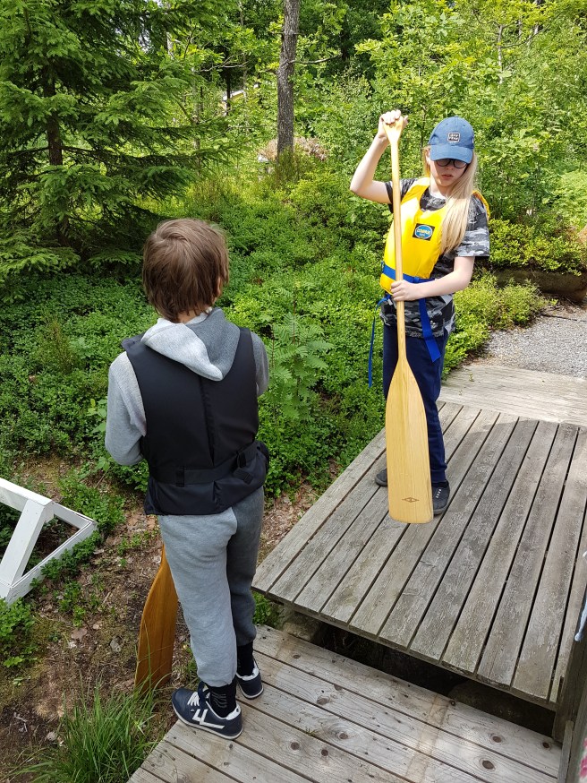 Jag och en kompis har tagit med oss barnen till naturen. Vi hyr en stuga vid en insjö. Vi har badat, paddlat och fiskat. Vi fick ingen fisk. Men vi har sett en groda och en död gräshoppa. Och så är det skönt att bara vara i naturen. Vi hör vågornas kluckande från verandan och en skrake vilar på en sten en bit bort. Det är en paus från vardagen helt enkelt.