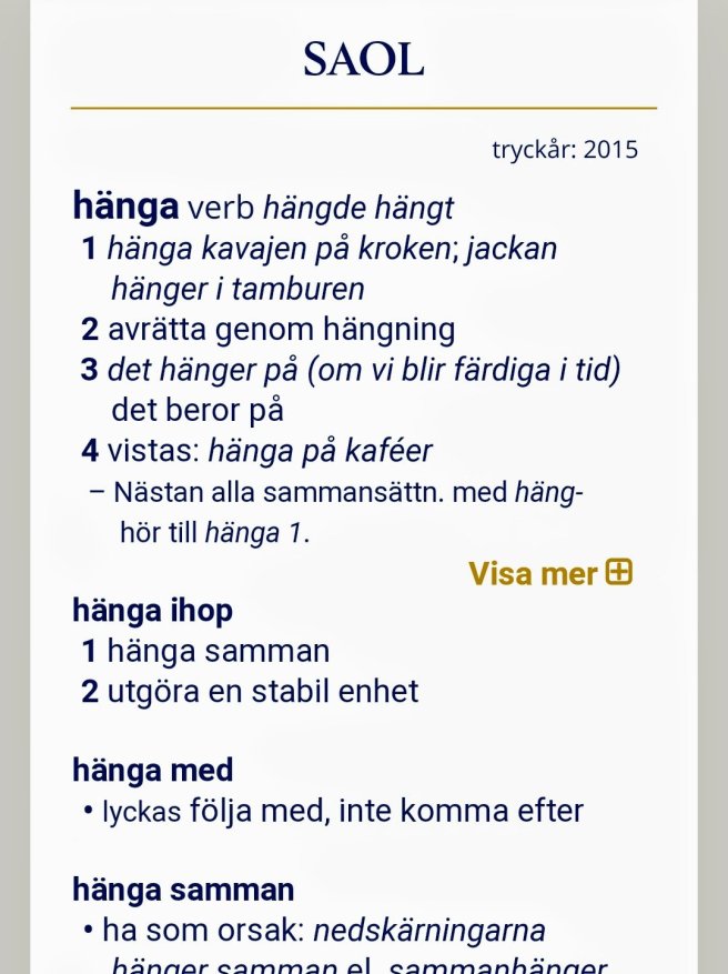 Jag pratade med en elev igår och det blev ett intressant missförstånd. Jag sa jag hänger inte med och menade ‘jag förstår inte. Eleven hade precis lärt sig att hänger med betyder ‘följer med’.