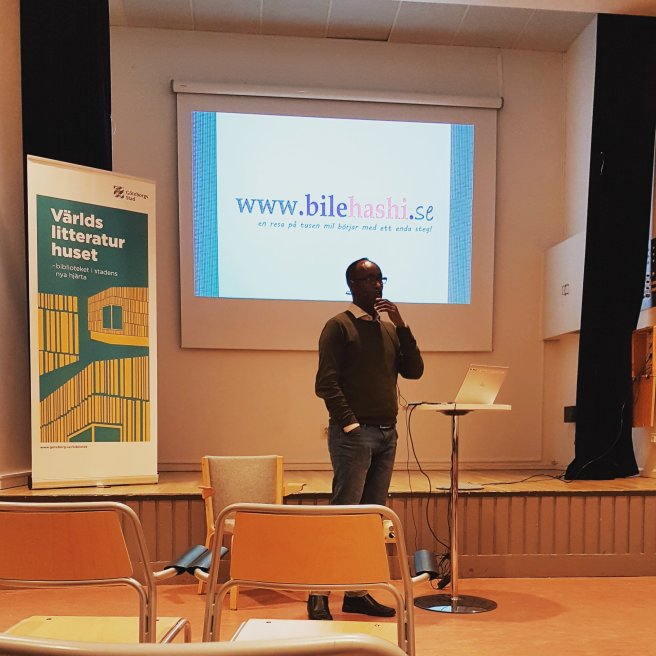 Jag var på föreläsning med Bile Hashi igår. Han gör många saker. Nu jobbar han som ekonom i Göteborg. Men han är också författare. Han har skrivit många böcker på somaliska. Föreläsningen var på somaliska. Han berättade om sitt skrivande.