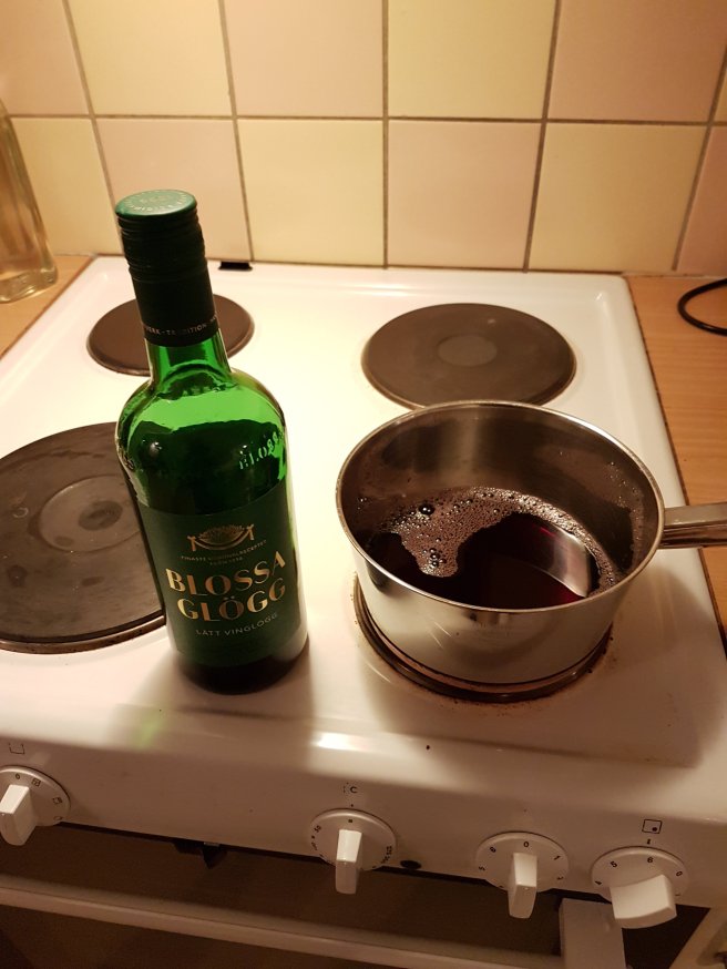Hemma värmde vi glögg och började klä granen. Först satte vi upp ljusslingan. Sen hängde vi upp alla julgranskulor, små figurer och alla andra små saker. Det brukar bli lite mer för varje år. Till sista satte vi stjärnan i toppen.