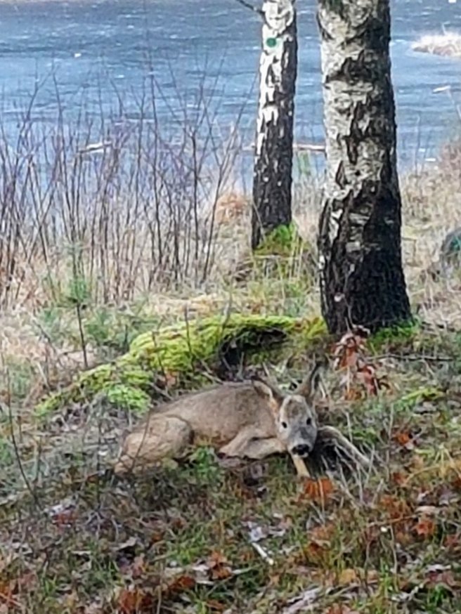 Vi hittade också ett rådjur som var sjukt eller skadat. Vi försökte ringa markägaren men ingen svarade. Rådjuret låg kvar fast vi gick jättenära. Vi tyckte synd om det.