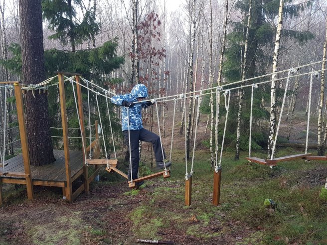 Uppe i skogen ligger en naturlekplats med en hinderbana. Barnen lekte i den.