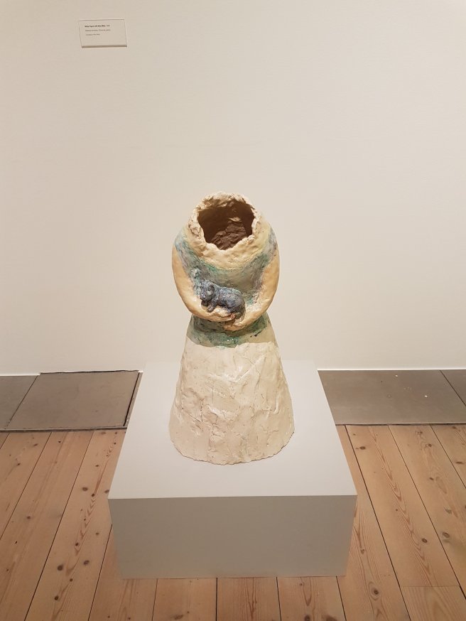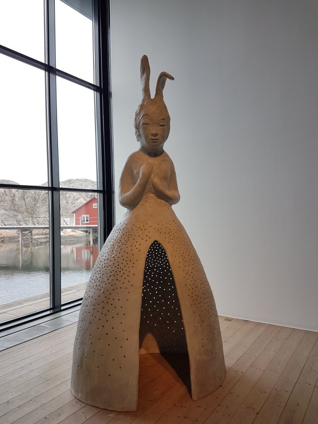 Konstnären heter Leiko Ikimura. Det är första gången hon ställer ut i Norden. Jag uppskattade verkligen utställningen. Det var både skulpturer och tavlor. I första rummet står den här vackra skulpturen som är både kanin och kvinnlig Buddha-gestalt samtidigt: