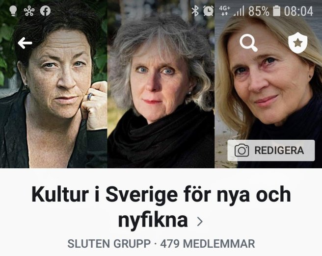 I alla fall. För att samla folk som är intresserade av kultur startade jag och två bekanta en ny facebookgrupp. Den heter Kultur i Sverige för nya och nyfikna. Välkommen att gå med om det låter intressant. Gruppen är lite trevande men vi är några som tipsar och kommenterar. Förhoppningsvis växer det successivt 🙂.