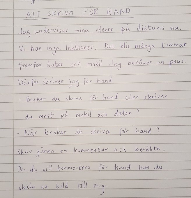 Att skriva för hand mars 26, 2020mars 26, 2020 ~ Kalle Cederblad Dela detta: Klicka för att dela på X (Öppnas i ett nytt fönster) X Klicka för att dela på Facebook (Öppnas i ett nytt fönster) Facebook Gilla Laddar in … Related Publicerad av Kalle Cederblad Sfi- och svensklärare som bloggar om svenska språket. Kolla in min kanal på youtube också. Visa alla inlägg av Kalle Cederblad