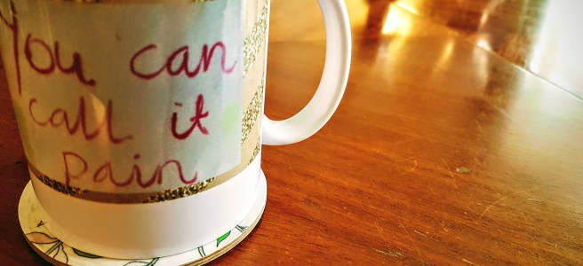Jag vaknade tidigt och tvättade kläder. Nu finns det tid att slappna av med en kopp kaffe. Jag tycker väldigt mycket om min kaffemugg. "You can call it pain", står det. Det betyder "man kan kalla det lidande" och är ett citat av den kinesiska konstnären Liu Xiaodong. Han beskriver den kreativa processen så. Jag … Fortsätt läsa Lördagmorgon – Morgonkaffe.