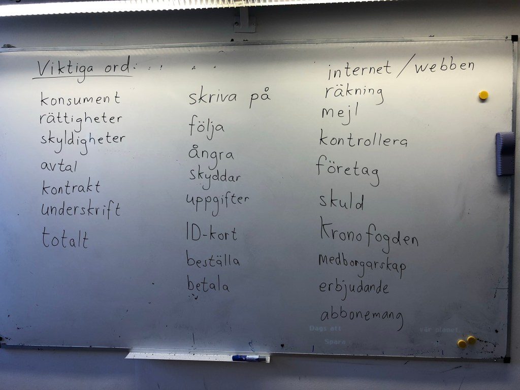 Idag tittade jag med mina elever på en film om konsumenters rättigheter och skyldigheter. Jag skrev hela texten åt dem och valde några viktiga ord att träna på. Titta på filmen. Läs texten. Träna på orden.