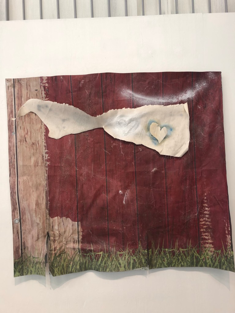 På väggen finns ett vitt stycke plast med ett hjärta. Det är slarvigt ditsatt. Det faller nästan av. Jag får en känsla av något tillfälligt. Något håller på att falla sönder. Färgen håller på att flagna av. Kanske började någon måla väggen men var tvungen att sluta mitt i. Plastbiten med hjärtat klistrades upp i all hast.