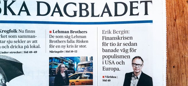 Svenska Dagbladet skriver om finanskrisen Just nu har vi en prenumeration på SvD helg. Vi får tidningen på helgen. Vi kan läsa alla artiklar digitalt. Jag och min fru gillar deras artiklar om kultur. Igår skrev de flera artiklar om finanskrisen. Jag hittade några intressanta ord. Finanskrisen är den händelse för 10 år sedan då … Fortsätt läsa Några uttryck om finanskrisen från Svenska Dagbladet | Ord och uttryck